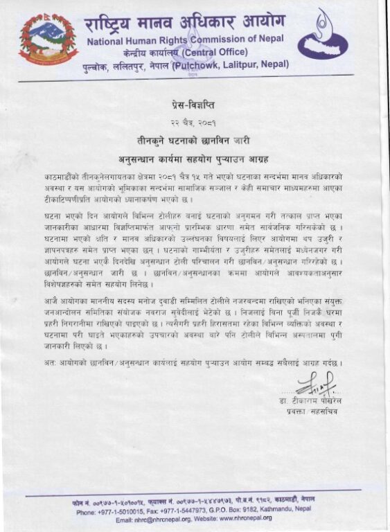 काठमाडौं, २२ चैत्र । राष्ट्रिय मानवअधिकार आयोगले चैत्र १५ गतेको तीनकुने घटना छानबिन गर्न समिति बनाएको छ ।