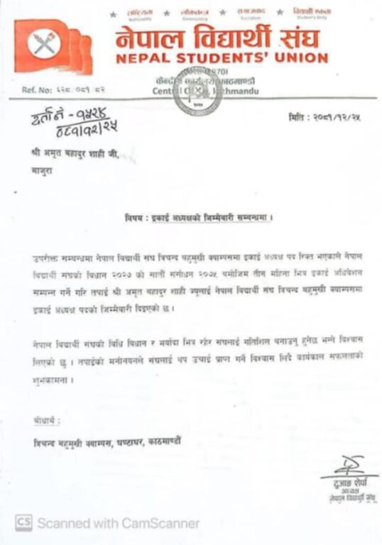 शाहीलाई त्रिचन्द्र क्याम्पसको नेविसंघ इकाई अध्यक्षको जिम्मेवारी