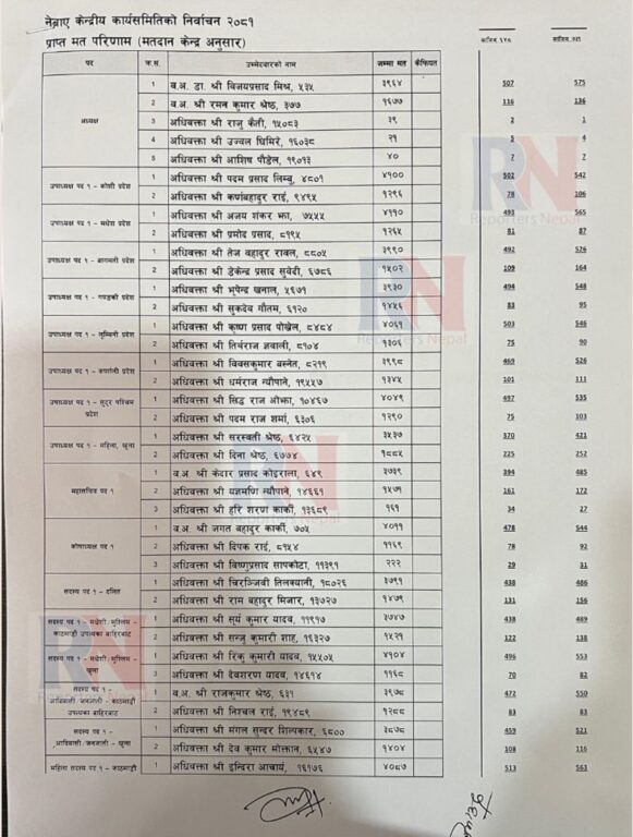 उक्त मत गणनामा अध्यक्षका प्रतिस्पर्धी बृहत् लोकतान्त्रिक, प्रगतिशली, पेसागत, राष्ट्रवादी एवं समावेशी कानुन व्यवसायी समूहबाट वरिष्ठ अधिवक्ता प्रा.डा.विजयप्रसाद मिश्रल ३ हजार ९ सय ६४ मत पाएका छन् भने व्यावसायिक कानुन व्यवसायी समूहका वरिष्ठ अधिवक्ता रमण श्रेष्ठले १ हजार ६ सय ७७ मत प्राप्त गरेका छन् । वरिष्ठ अधिवक्ताद्वय मिश्र र श्रेष्ठबीचको मतान्तर २ हजार २ सय ८७ (दोब्बरभन्दा बढी) रहेको छ ।