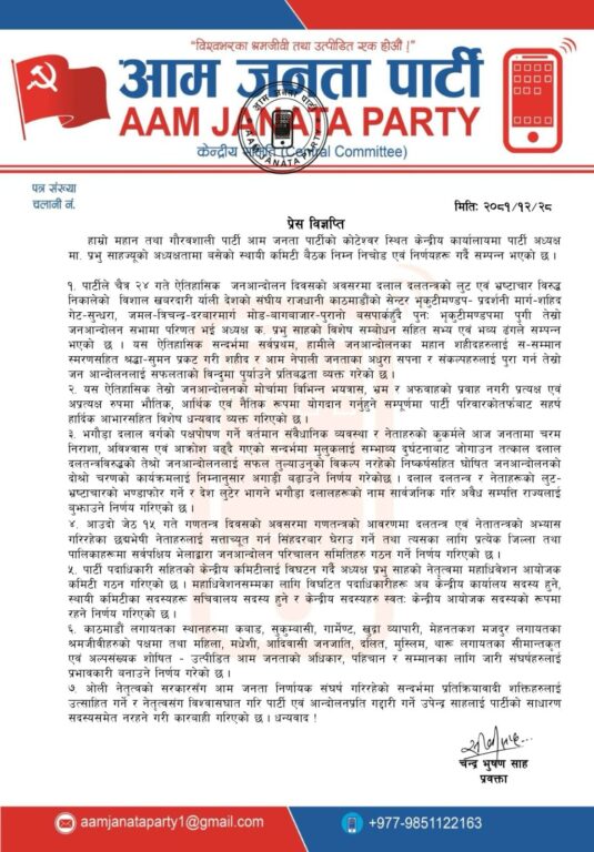 काठमाडौं । आम जनता पार्टी (आजपा)ले देश लुटेर भाग्ने भगौडा दलालहरूको नाम सार्वजनिक गर्ने निर्णय सहित केन्द्रीय कमिटी विघटन गरेको छ । केन्द्रीय कमिटी विघटन गरी प्रभु साहको अध्यक्षतामा महाधिवेशन आयोजक कमिटी गठन गरिएको छ ।