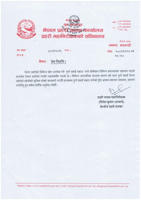 प्रहरीको विभिन्न स्रोत उल्लेख गरी ‘दुर्गा प्रसाईँ पक्राउ’ भन्ने शीर्षकमा विभिन्न सञ्चारमाध्यममा समाचार प्रकाशन भएकामा आफूहरूको गम्भीर ध्यानाकर्षण भएको प्रहरी प्रवक्ता प्रहरी नायब महानिरीक्षक दिनेशकुमार आचार्यले जानकारी दिएका छन्।