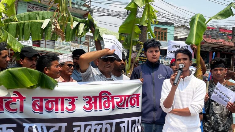 पटक–पटक सम्बन्धित निकायलाई झक्झक्याउँदा पनि चासो नदिएपछि बुधबार स्थानीयले एक घण्टा सडक चक्काजाम गर्नाका साथै सडकमा केरासमेत रोपेका थिए । बसपार्कस्थित पीपलबोट नजिक चक्काजामसहित सडकमा केराका बिरुवा रोपिएको सङ्घर्ष समितिका सदस्य दीपक काफ्लेले बताए।