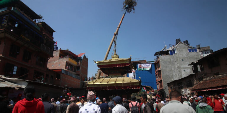 भक्तपुर, ५ वैशाख । भक्तपुरमा आठ रात नौ दिनसम्म चल्ने बिस्केट जात्राको आज अन्तिम दिन भक्तपुरको पोटरीस्क्वायरस्थित तालाक्वो ज्याठा गणेश मन्दिर अगाडि उठाइएको हात नभएको लिङ्गो ढालिएको छ ।