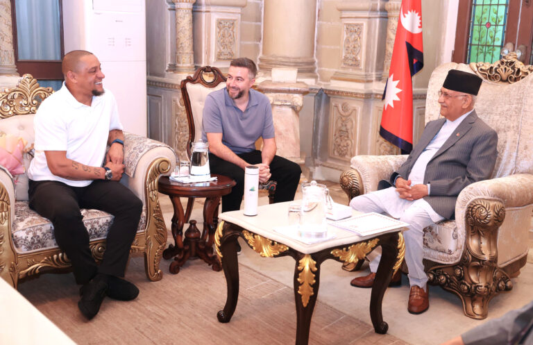 काठमाडौँ, १० वैशाख । प्रधानमन्त्री केपी शर्मा ओली र ब्राजिलका चर्चित फुटबल खेलाडी रोबर्टो कार्लोसबीच प्रधानमन्त्री तथा मन्त्रिपरिषद्को कार्यालय, सिंहदरबारमा आज भेटघाट भएको छ ।