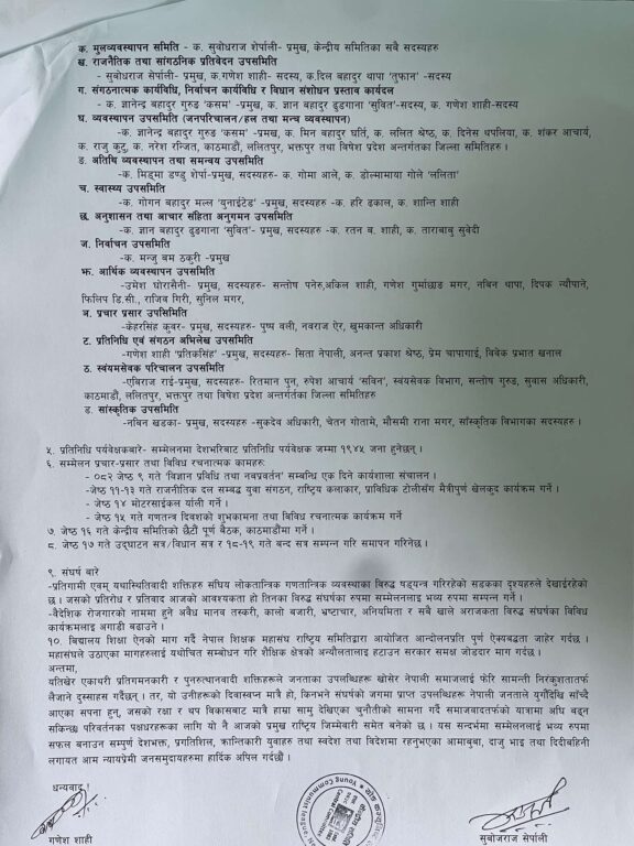 त्यसैगरी, प्रदेश सम्मेलनहरु जेठ ५ गतेसम्म गरिसक्ने, जसअन्तर्गत बागमतीको वैशाख १७ र १८ गते काठमाडौंमा, विशेष प्रदेशको वैशाख १९ गते काठमाडौंमा, गण्डकीको वैशाख २० र २१ गते पोखरामा, सुदुरपश्चिमको बैशाख २३ र २४ गते धनगढीमा, कोशी प्रदेशको वैशाख २६ र २७ गते, कर्णालीको २९ र ३० गते सुर्खेतमा, लुम्बिनीको जेठ १ र २ गते दाङमा र मधेशको जेठ ४ र ५ गते गर्ने निर्णय भएको बताइएको छ ।