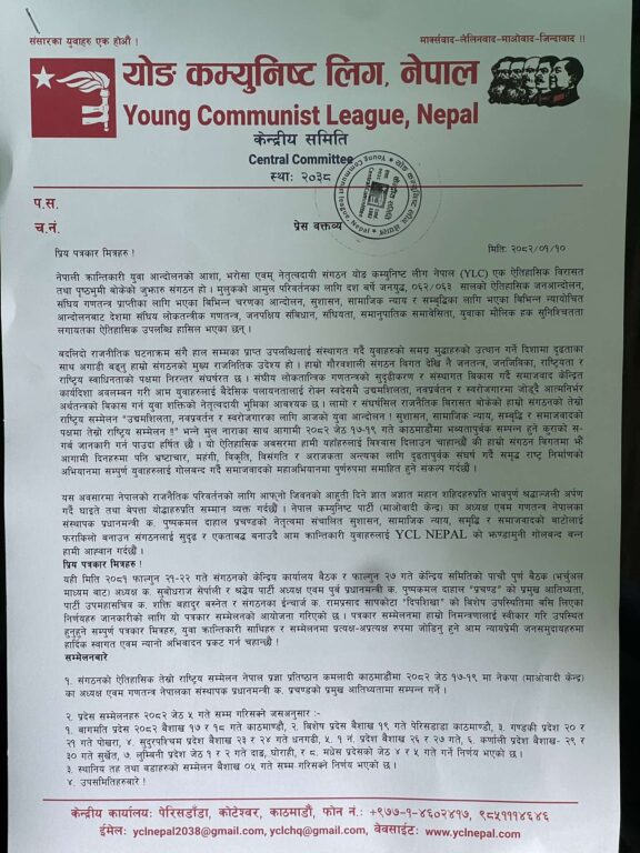 पत्रकार सम्मेलनलाई सम्बोधन गर्दै वाईसीएल अध्यक्ष सुवोधराज सेर्पालीले भने, ‘स्थानीय तहका चार यसभन्दा बढी सम्मेलन हामीले सम्पन्न गरिसकेका छौं । यही १७ गतेदेखि प्रदेश सम्मेलन सुरु हुने र जेठको ५ गतेसम्म सबै प्रदेशका सम्मेलनहरु सम्पन्न गर्दैछौं । जेठको १७ गते हामीले राष्ट्रिय सम्मेलनको ऐतिहासिक उद्घाटन शत्र सुरु गर्ने र त्यसै दिन विधान शत्र सुरु गर्ने, विधान पारित गर्ने, १८ र १९ गते बन्दशत्र गरेर समापन गर्नेगरी हामीले सम्मेलनको कार्ययोजना तयार गरेका छौं ।’