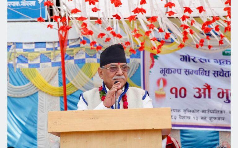 ‘गोरखा भूकम्प’को केन्द्रविन्दु बारपाक सुलिकोट गाउँपालिका–२, बारपाकमा आज आयोजित ‘भूकम्प स्मृति दिवस’ कार्यक्रमलाई सम्बोधन गर्दै अध्यक्ष दाहालले गोरखाको विकास निर्माणको कामलाई अगाडि बढाउन सक्दो पहल र प्रयत्न भइरहेको बताए ।