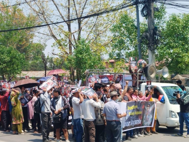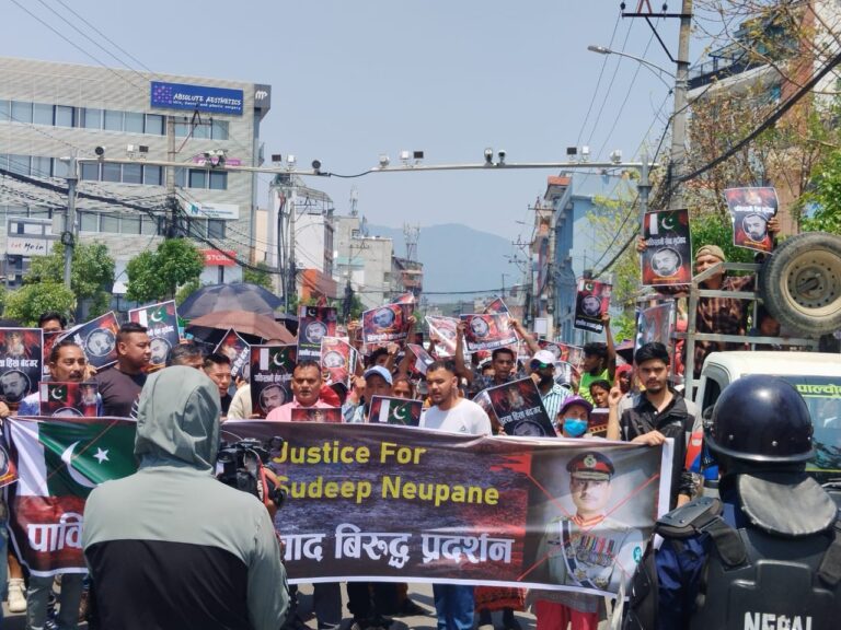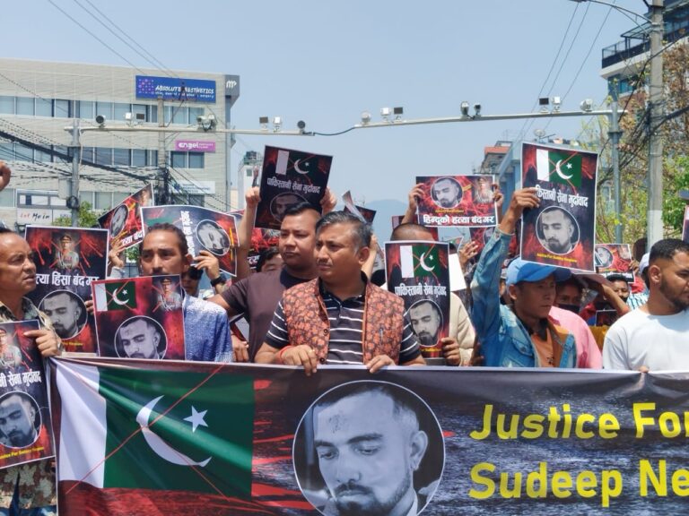 उनीहरुको ब्यानरमा ‘जस्टिस फर सुदीप न्यौपाने’ र पाकिस्तानी आतंकवादविरुद्ध प्रदर्शन लेखिएको थियो ।