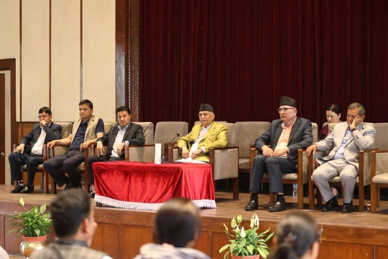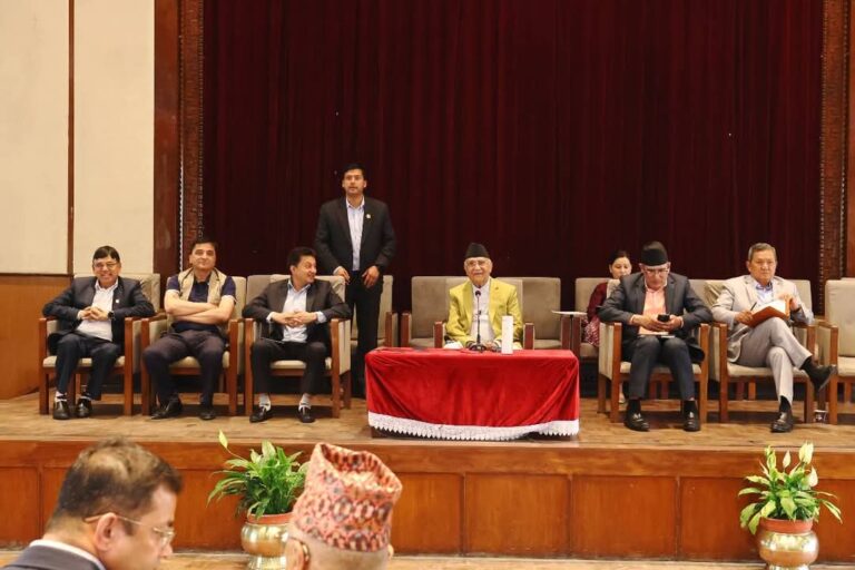 उनले भने, ‘हिजोसम्म आगो नै बाल्न खोजेका थिए, शेबहादुरजी फर्केर आउनेबित्तिकै सरकार ढल्छ भनेर, विमानस्थलमा ओर्लिनेबित्तिकै ढल्छ कि जस्तो पारेका थिए, ढल्यो ढल्यो, बांगिसकेको छ, शेरबहादुरजी आउनेबित्तिकै ढलिहाल्छ। मैले साथीहरुलाई भन्दै आइरहेको छु, भ्रम फिजाउने तत्वहरुले भ्रम फिजाइरहन्छन्, यसको पछाडि नकुद्नुस्, काममा लाग्नुस्, मिसन २०८४ मा लाग्नुस् ।’ यसअघि एमालेले यही बैशाख ११ गते लोकतन्त्र दिवसको अवसरमा आयोजना गरेको युथ सेलिब्रेशन कार्यक्रममा पनि प्रधानमत्री ओलीले आफूहरुलाई सरकारको भन्दापनि चुनावको चिन्ता भएको बताएका थिए । फोटोः प्रधानमन्त्री ओलीको सचिवालय