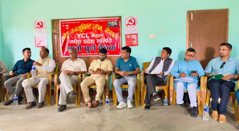 काठमाडौं, १५ वैशाख । नेकपा (माओवादी केन्द्र) को सहायक संगठन योङ्ग कम्युनिष्ट लिग (वाईसीएल) नेपालको मधेश प्रदेश समितिको पूर्ण बैठक सम्पन्न भएको छ । माओवादी केन्द्र मधेश प्रदेश इन्चार्ज मातृका यादवको प्रमुख आतिथ्यता, वाईसीएल नेपाल इन्चार्ज रामप्रसाद सापकोटा ‘दीपशिखा’ र पार्टी केन्द्रिय सदस्य महेन्द्र पासवानको विशेष आतिथ्यतामा जनकपुरमा पूर्ण बैठक सम्पन्न भएको हो ।