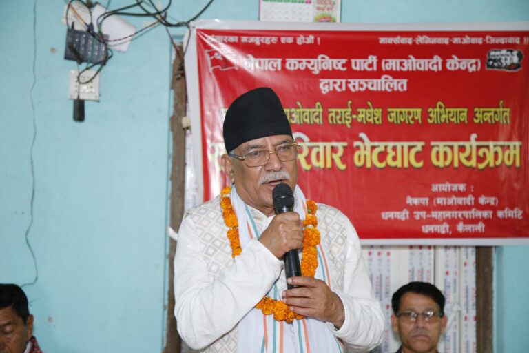 काठमाडौं, १६ वैशाख । नेकपा (माओवादी केन्द्र) का अध्यक्ष एवं पूर्वप्रधानमन्त्री पुष्पकमल दाहाल ‘प्रचण्ड’ले सहिद र बेपत्ता भएका परिवारका मागलाई पार्टीले गम्भीरतापूर्वक लिएको बताएका छन् । आज धनगढी उपमहानगरपालिका–१८ फूलबारी डिपो बजारमा आयोजित सहिद परिवारहरूसँग भेटघाट तथा अन्तक्र्रिया कार्यक्रममा उनले सशस्त्र युद्ध सफल पार्न सहिद एवं बेपत्ता भएका व्यक्तिको महत्वपूर्ण योगदान रहेको स्मरण गरे ।