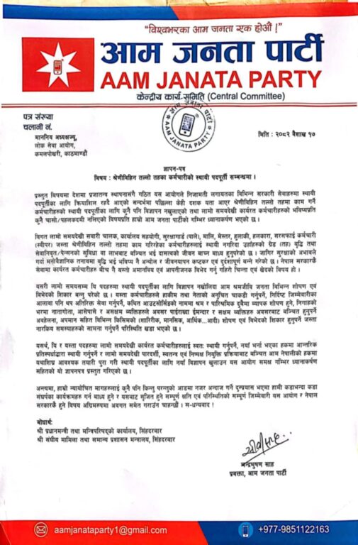 नेपाल सरकारकै सेवामा कार्यरत कर्मचारीहरु बीच नै अमानविय एवं आपतीजनक विभेद गर्नु गहिरो चिन्ता एवं खेदको विषय भएको आजपाले जनाएको छ । आजपाले श्रेणीविहिन तल्लो तहमा लामो समयदेखी कार्यरत कर्मचारीहरुलाई स्वतः स्थायी गर्नुपर्ने, नयाँ भर्ना भएका हकमा आन्तरिक प्रतिस्पर्धाद्धारा स्थायी गर्नुपर्ने र लामो समयदेखी पारदर्शी, स्वतन्त्र एवं निष्पक्ष नियुक्ति प्रक्रियाबाट बञ्चित आम नेपालीको हकमा यथाशिघ्र आवश्यक तयारी पुरा गरी स्थायी पदपूर्तीका लागि नयाँ विज्ञापन खुलाउन माग गरेको हो ।