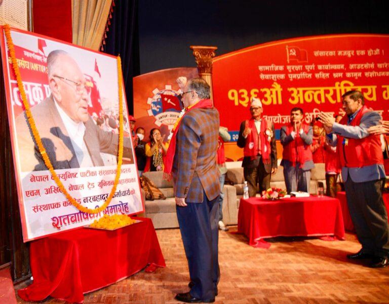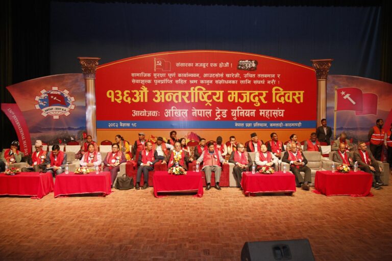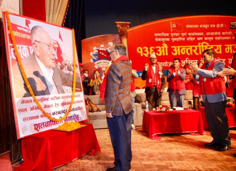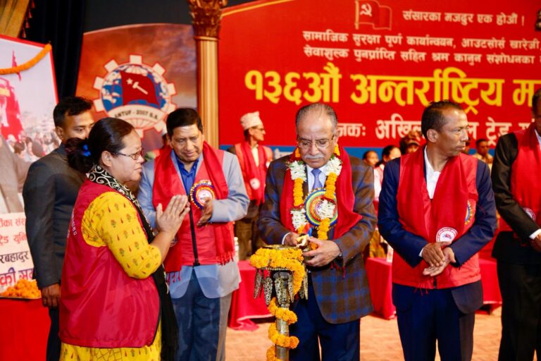 काठमाडौं, १८ वैशाख । अखिल नेपाल ट्रेड युनियन महासंघ केन्द्रीय समितिद्वारा आयोजित १३६औं अन्तर्राष्ट्रिय श्रमिक दिवसको कार्यक्रम शुरू भएको छ । कार्यक्रमको उद्घाटन नेपाल कम्युनिस्ट पार्टी (माओवादी केन्द्र) का अध्यक्ष तथा पूर्वप्रधानमन्त्री पुष्पकमल दाहाल ‘प्रचण्ड’ ले गरेका छन् ।