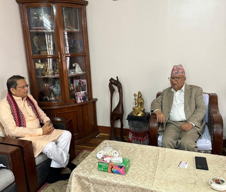 काठमाडौं, १८ बैशाख । नेपाल भ्रमणमा रहेका भारतीय जनता पार्टीका विदेश विभाग प्रमुख डा. विजय चौथाईवालेले राजनीतिक भेटवार्ता बढाएका छन् । केहीबेर अघि उनले नेकपा एकीकृत समाजावदी) का अध्यक्ष तथा पूर्व प्रधानमन्त्री माधवकुमार नेपालसँग भेट गरेका छन् । अध्यक्ष नेपाललाई भेट्न चौथाईवाले नेपाल निवास कोटेश्वर पुगेका थिए ।