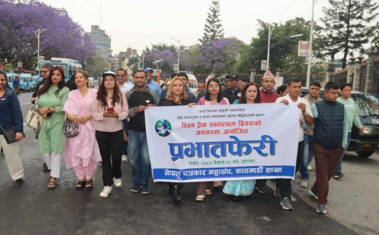 काठमाडौं, वैशाख २० । विश्व प्रेस स्वतन्त्रता दिवसको अवसरमा नेपाल पत्रकार महासङ्घ काठमाडौँ शाखाले आज यहाँ प्रभातफेरी आयोजना गरेको छ। ‘नयाँ विश्वमा साहसी पत्रकारिता, प्रेस स्वतन्त्रता र सञ्चार माध्यममा कृतिम बौद्धिकताको प्रभाव’ भन्ने नाराका साथ आयोजित प्रभातफेरी रत्नपार्क शान्तिकाबाट सुरू भइ भृकुटीमण्डपमा पुगेर सभामा परिणत भएको थियो । त्यसअवसरमा प्रेस तथा अभिव्यक्तिका लागि समयमा भएका संघर्षमा योगदान गर्ने सम्पूर्ण पत्रकारप्रति श्रद्धाभाव प्रकट गरियो ।
