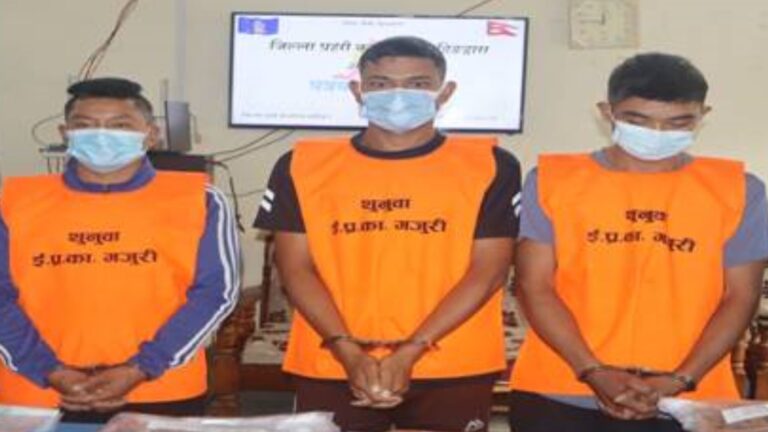 काठमाडौं, २१ वैशाख । धादिङको गजुरी पाउँपालिका-२ का ६० वर्षीय चुडामणि कँडेललाई कर्तव्य गरी हत्या गरेको आरोपमा तीन जना पक्राउ परेका छन् । पक्राउ पर्नेहरुमा मकवानपुरको राक्सिराङ गाउँपालिका– ९ का अक्कलबहादुर प्रजा, पृथलाल थिङ र सञ्चलाल मुक्तान रहेका छन् । गत चैत २७ गते आफ्नै घरको भुँईतलाको कोठाभित्र रहेको एटेच ट्वाईलेट बाथरुमभित्रको भुँईमा घाँटीमा डोरी कसिएको अवस्थामा कँडेलको शव फेला परेको थियो ।
