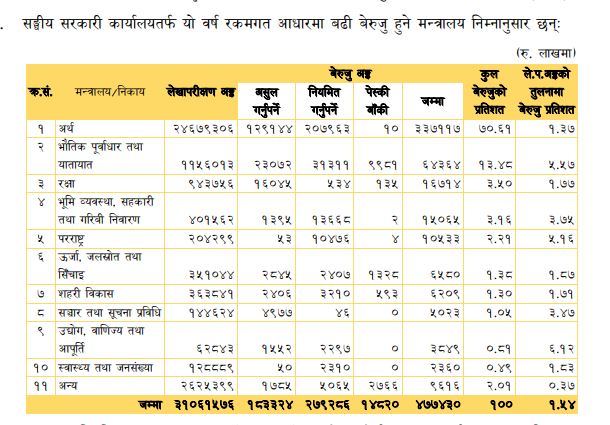 त्यसैगरी, रक्षा मन्त्रालयको बेरुजु ३ दशमलव ५० प्रतिशत, भूमि व्यवस्था, सहकारी तथा गरिबी निवारण मन्त्रालयको बेरुजु ३ दशमलव १६ प्रतिशत, परराष्ट्र मन्त्रालयको बेरुजु २.२१ प्रतिशत, ऊर्जा, जलस्रोत तथा सिचाइँ मन्त्रालयको बेरुजु १ दशमलव ३८ प्रतिशत, सहकारी विकास मन्त्रालयको १ दशमलव ३० प्रतिशत रहेको छ ।