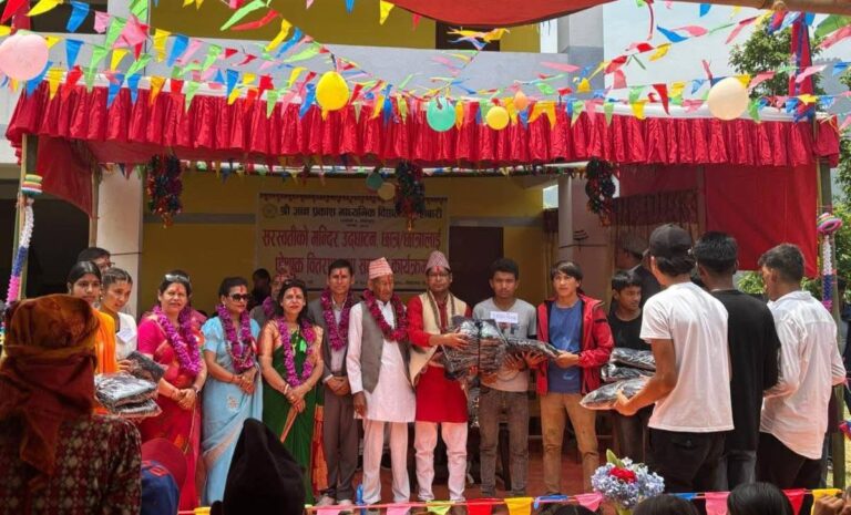 काठमाडौँ, ५ जेठ । ओखलढुंगा जिल्लाको चम्पादेवी गाउँपालिका–७ स्थित श्री ज्ञान प्रकाश माध्यमिक विद्यालय, फुलबारीमा एक भव्य समारोहका बीच सरस्वती मन्दिर उद्घाटन, विद्यार्थी पोशाक वितरण, खेलकुद सामग्री हस्तान्तरण र अक्षयकोष स्थापनासहितको विशेष कार्यक्रम सम्पन्न भएको छ।