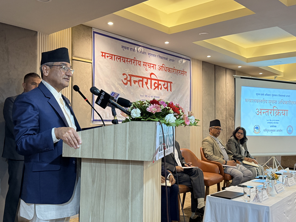 राष्ट्रिय सूचना आयोगले आज यहाँ आयोजना गरेको मन्त्रालयस्तरीय सूचना अधिकारीहरूसँग अन्तक्र्रिया कार्यक्रमलाई उनले संविधानमा सूचनाको हकलाई मौलिक हकका रुपमा राखिएको बताए ।