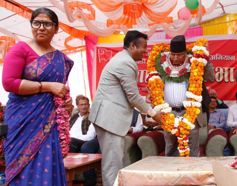 काँक्रेविहार, ७ जेठ । नेपाल कम्युनिस्ट पार्टी (माओवादी केन्द्र) का अध्यक्ष पुष्कमल दाहाल ‘प्रचण्ड’लाई रुकुम पश्चिमको चौरजहारी नगरपालिकामा आयोजित जनसभामा चौरजहारी नगरपालिकाका नगरप्रमुख पुष्प बादीले माला लगाएर स्वागत गनुहुँदै । तस्बिरः हेमन्त केसी/रासस