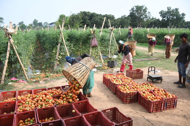दाङ, ८ जेठ । दाङको घोराही उपमहानगरपालिका–१६ स्थित तेरौटेमा सञ्चालित कृषि फर्ममा बिक्रीका लागि गोलभेँडा सङ्कलन गर्दै श्रमिकहरू।