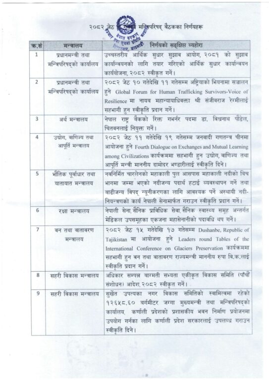 काठमाडौं, ८ जेठ । मन्त्रिपरिषदको यही जेठ ६ गते मंगलबार बसेको बैठकले विभिन्न ९ निर्णय गरेको छ ।