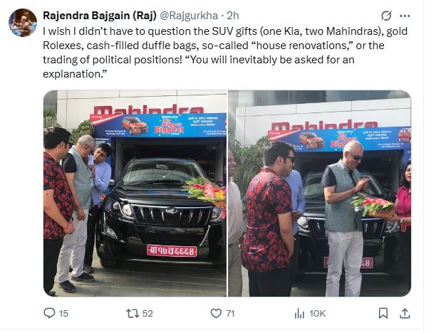 उनले शशांकलाई एउटा किया र महिन्द्रा एसयुभी गाडी, रोलेक्स घडी, पैसाले भरिएको महँगो ब्यागलगायतका बहुमूल्य उपहार दिएको स्मरण गराएका छन् । उनले ती उपहारबारे पनि शशांकसँग स्पष्टीकरण सोधिनुपर्ने बताएका छन् । ‘म चाहँदैनथेँ कि मलाई किया र दुईवटा महिन्द्राजस्ता एसयूभी उपहारहरू, रोलेक्स घडी, नगदले भरिएका डफेल झोलाहरू, तथाकथित घरको जीर्णोद्धारु वा राजनीतिक पदहरूको सौदाबाजीबारे प्रश्न उठाउनुपरोस् । तर याद राख्नुहोस्, स्पष्टीकरण तपाईंलाई सोधिनै पर्नेछ,’– नेता बजगाईँले भनेका छन् ।