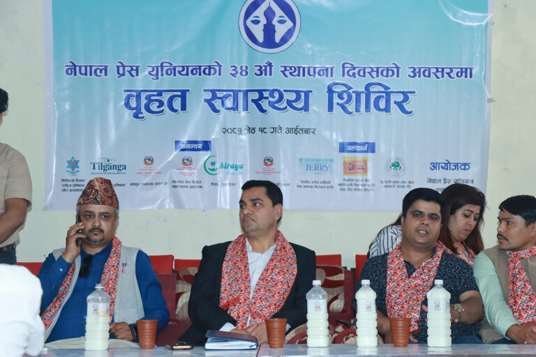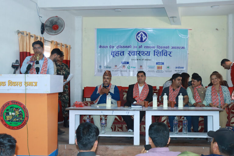 काठमाडौं, १८ जेठ । नेपाल प्रेस युनियन काठमाडौँ शाखाको आयोजनामा वृहत स्वास्थ्य शिविर सम्पन्न भएको छ । नेपाल प्रेस युनियनको ३४औं स्थापना दिवसको अवसरमा अनामनगरको सामाजिक विकास भवनमा शिविर सञ्चालन गरिएको थियो ।