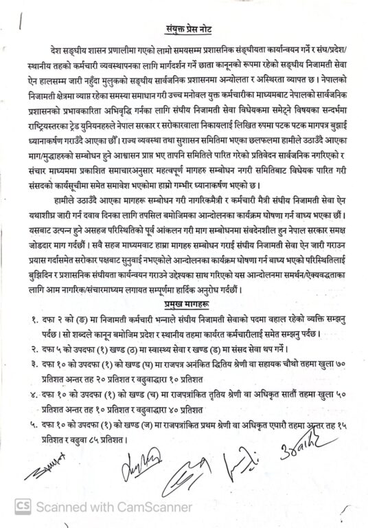 ‘हामीले उठाउँदै आएका मागहरू सम्बोधन गरी नागरिकमैत्री र कर्मचारी मैत्री संघीय निजामती सेवा ऐन यथाशीघ्र जारी गर्न दवाव दिनका लागि तपसिल बमोजिमका आन्दोलनका कार्यक्रम घोषणा गर्न वाध्य भएका छौं । यसबाट उत्पन्न हुने असहज परिस्थितिको पूर्व आंकलन गरी माग सम्बोधनमा संवदेनशील हुन नेपाल सरकार समक्ष जोडदार माग गर्दछौं । सवै सहज माध्यमवाट हाम्रा मागहरु सम्बोधन गराई संघीय निजामती सेवा ऐन जारी गराउन प्रयास गर्दासमेत सरोकार पक्षबाट सुनुवाई नभएकोले आन्दोलनका कार्यक्रम घोषणा गर्न बाध्य भएको परिस्थितिलाई बुझिदिन रप्रशासनिक संघीयता कार्यन्वयन गराउने उद्देश्यकासाथ गरिएको यस आन्दोलनमा समर्थन ऐक्यवद्धताका लागि आम नागरिक संचारमाध्यम लगायत सम्पूर्णमा हार्दिक अनुरोध गर्दछौं,’– विभिन्न ६ वटा संगठनले जारी गरेको विज्ञप्तिमा भनिएको छ ।