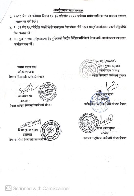 उनीहरुले आन्दोलनका कार्यक्रमहरुमा जेठ २३ गते विहान १० देखि १२ बजेसम्म संघीय मामिला तथा सामान्य प्रशासन मन्त्रालयमा धर्ना दिने, २५ गतेदेखि अर्को निर्णय नभएसम्म देशभरीका तीनै तहका सम्पूर्ण कार्यालयहरुका कालो पट्टी बाँधेर सेवा प्रवाह गर्ने निर्णय गरेका छन् । त्यति गर्दा पनि आफूहरुको माग पूरा नभएमा राष्ट्रिय स्तरका ट्रेड युनियनको केन्द्रीय निर्देशन समितिको बैठक बसी आन्दोलनको थप सशक्त कार्यक्रम तय गर्ने उनीहरुको चेतावनी रहेको छ ।