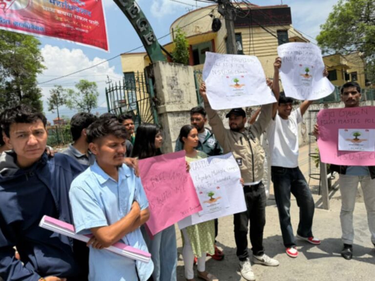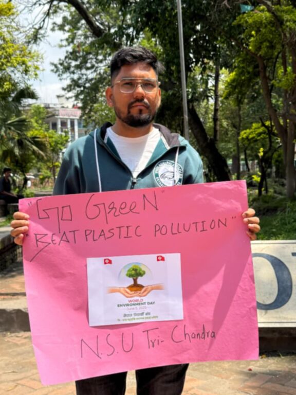 काठमाडौं, २२ जेठ । नेपाल विद्यार्थी संघ त्रि–चन्द्र बहुमुखी क्याम्पस इकाईले आज विशेष कार्यक्रमको आयोजना गरी प्लास्टिक प्रदूषणविरुद्ध सचेतना फैलाउने र दबाब सिर्जना गर्ने अभियान सञ्चालन गरेको छ। जुन ५ (जेठ २२) का दिन विश्वभर विविध कार्यक्रमहरूका साथ मनाइने विश्व वातावरण दिवस यसवर्ष “Beat the Plastic Pollution” भन्ने मुख्य नाराका साथ नेपालमा पनि व्यापक रूपमा मनाइँदैछ।