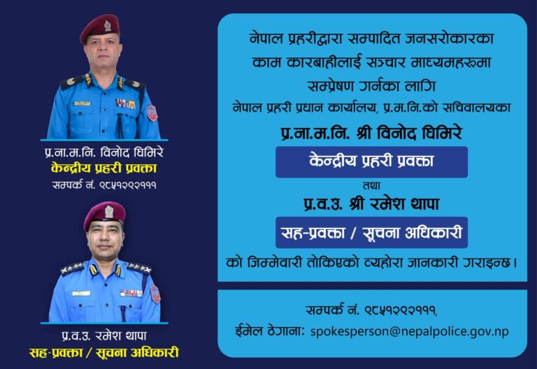 प्रहरी प्रधान कार्यालयले भनेको छ,‘नेपाल प्रहरीद्धारा सम्पादित जनसरोकारका कामकारबाहीलाई सञ्चार माध्यमहरुमा सम्प्रेषण गर्नको लागि नेपाल प्रहरी प्रधान कार्यालय प्रहरी महानिरीक्षकको सचिवालय डिआईजी विनोद घिमिरेलाई जिम्मेवारी तोकिएको व्यहोरा जानकारी गराईन्छ ।’