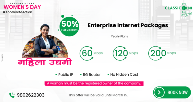 काठमाडौं, २३ जेठ । देशकै अग्रणी तथा ठुलो इन्टरनेट नेटवर्क सेवाप्रदायक कम्पनी क्लासिकटेकले अन्तर्राष्ट्रिय नारी दिवस (२०२५) को अवसरमा उधामी महिलाहरुको लागि ५० % फ्ल्याट डिस्काउन्ट मा उधामी प्याकेज अफर सार्वजनिक गरेको छ।