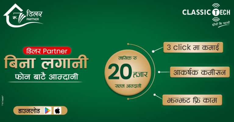 काठमाडौं, २६ जेठ । देशकै अग्रणी तथा ठुलो इन्टरनेट नेटवर्क सेवाप्रदायक कम्पनी क्लासिकटेकले डिलर पार्टनर आह्वान गरेको छ। शुन्य लगानीमा डिलर पार्टनर बन्न डिलर एपमार्फत फोनबाट सजिलै जताबाट पनि मासिक २० हजारसम्म आम्दानी गर्न सकिनेछ । डिलर पार्टनर एप निकै सहज भएकोले ३ click मा कमाई हुने र झन्झट नहुने पनि कम्पनीको भनाइ छ।