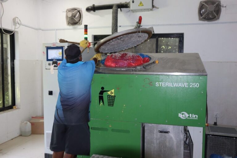 माइक्रोवेभ टेक्नोलोजीसहितको स्रेडिङ मेसिन अस्पतालको बायोमेडिकल फोहर प्रशोधन गर्ने मुख्य उपकरण हो । अस्पतालबाट निस्कने सिसा, धारिलो वस्तु (निडल, सर्जिकल ब्लेड), कपडाका टुक्रा र प्लास्टिकजस्ता सबै प्रकारका फोहर मिसाएर राख्न सकिन्छ । यो मेसिनको क्षमता दुई सय ५० लिटर रहेको उनले जानकारी दिए । मिश्रले भने, “यसले करिब ३० मिनेटमा फोहरलाई प्रशोधन गर्छ । मेसिनभित्र रहेको स्रेडर ब्लेडले फोहरलाई सानो टुक्रा बनाउँछ र सँगै रहेको इन्टिग्रेटेड माइक्रोवेभ टेक्नोलोजीले यसलाई स्टेरिलाइज (निसङ्क्रमण) गर्छ ।”