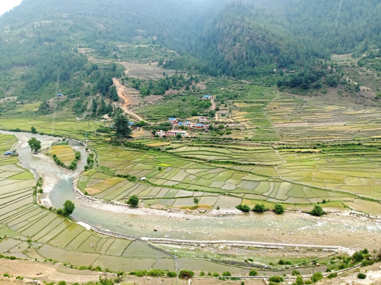 जुम्ला, ३० जेठ । जुम्लाको सिंजा उपत्यका पर्ने कनकासुन्दरी गाउँपालिका ६ स्थित गौरुचौरबाट देखिएको हिमा नदी र मार्सीधान खेतको फाँट । तस्बिर : विजय रावत / रासस
