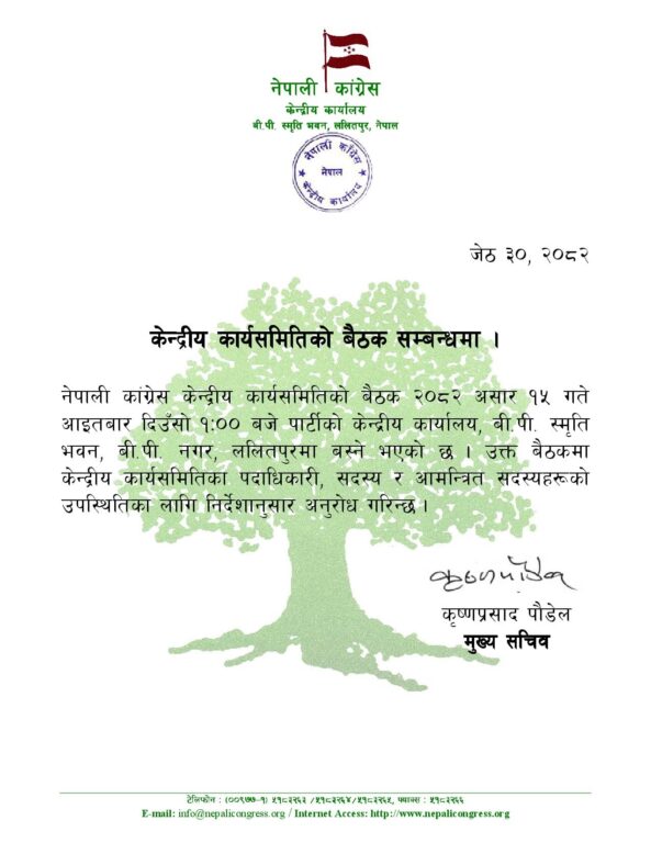 काठमाडौं, ३० जेठ । नेपाली कांग्रेसका सभापति शेरबहादुर देउवाले पाटीको केन्द्रीय कार्यसमितिको बैठक बोलाएका छन् । बैठक आगामी असार १५ गते दिउँसो १ बजे बस्नेगरि बोलाईएको मुख्यच सचिव कृष्णप्रसाद पौडेलले जनाएका छन् ।