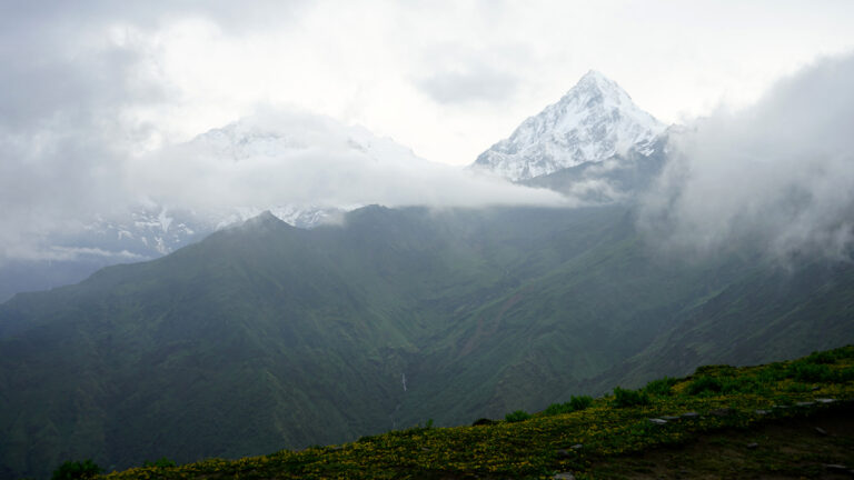 म्याग्दी, १ असार । म्याग्दीको अन्नपूर्ण गाउँपालिका–५ खोप्रा (खोपारा)बाट आइतबार बिहान बादलको घुम्टोभित्र देखिएको अन्नपूर्ण हिमालको दृश्य ।