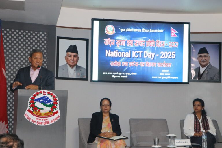 मन्त्रायले आज राष्ट्रिय सूचना तथा सञ्चार प्रविधि दिवस–२०८२ को समीक्षा तथा प्रशंसा–पत्र वितरण कार्यक्रममा मन्त्री गुरुङले सूचना प्रविधिको विकास स्थानीय तहसम्मै व्यापक हुनुपर्नेमा जोड दिए ।
