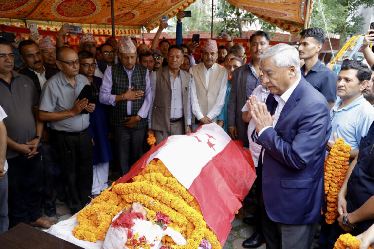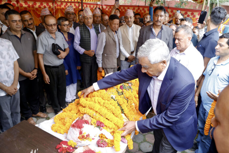 ललितपुर, ४ असार । नेपाली कांग्रेसका सभापति एवं पूर्वप्रधानमन्त्री शेरबहादुर देउवा बुधबार पार्टी कार्यालय सानेपामा नेका पूर्वसांसद ढुण्डिराज शास्त्री पौडेलको पार्थिव शरीरमा माल्यार्पण गर्नुहुँदै । तस्बिर / रासस