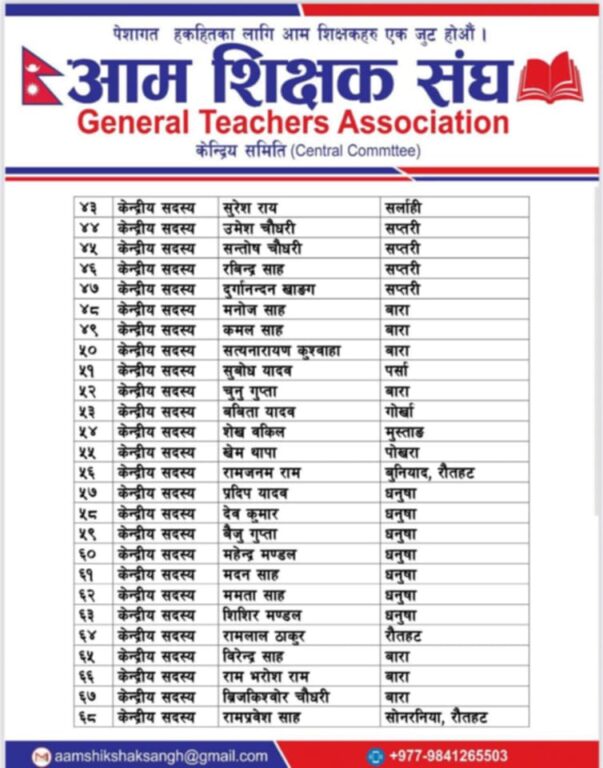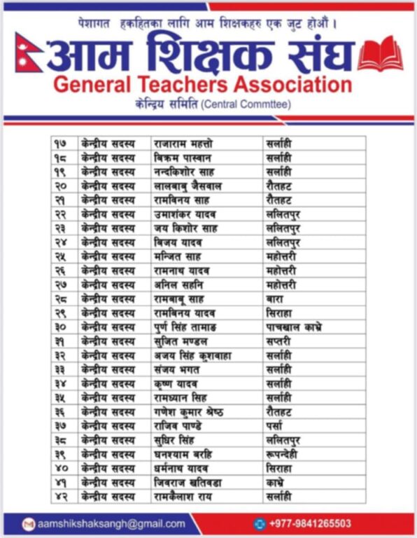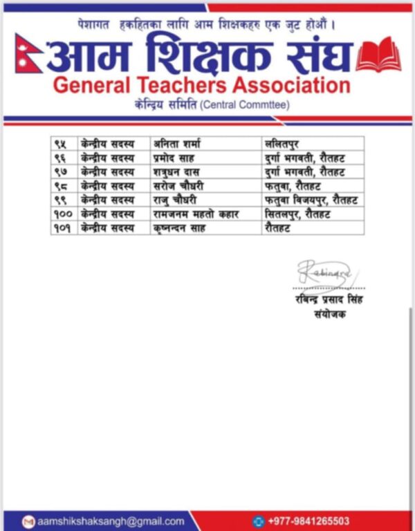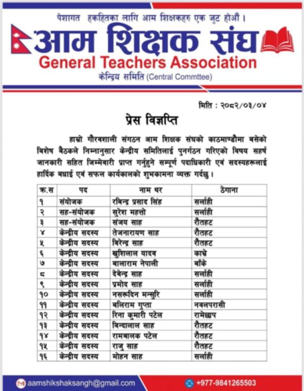 काठमाडौं, ५ असार । आम जनता पार्टी (आजपा) निकटको आम शिक्षक संघको केन्द्रीय कमिटी पुनर्गठन भएको छ । रबिन्द्र प्रसाद सिंहको संयोजकत्वमा एक सय एक सदस्यीय कमिटी पुनर्गठन भएको छ ।