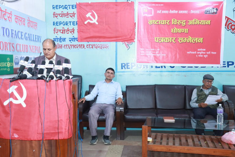 काठमाडौं, ५ असार । क्रान्तिकारी कम्युनिष्ट पार्टी नेपाल ९ नम्बर व्यूरोले भ्रष्टाचारविरुद्धको अभियान घोषणा गरेको छ । आज (बिहीबार) रिपोर्टर्स क्लब नेपालमा पत्रकार सम्मेलन गर्दै क्रान्तिकारी कम्युनिष्ट पार्टीले भ्रष्टाचारविरुद्धको अभियान घोषणा गरेको हो ।