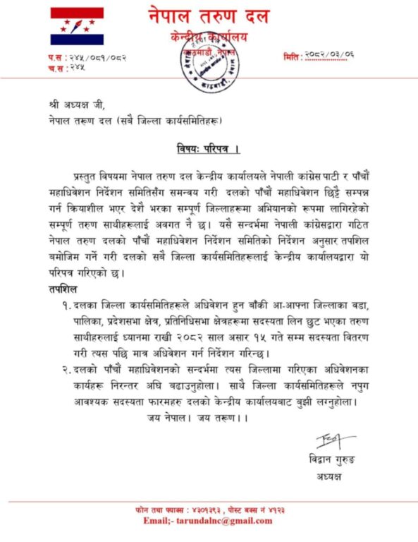 काठमाडौं, ६ असार । नेपाल तरुण दल अध्यक्ष विद्वान गुरुङले सबै जिल्ला कार्यसमितिलाई दुई बुदे परिपत्र जारी गरेका छ्न् । अध्यक्ष गुरुङले नेपाली काङ्ग्रेस पार्टीद्वारा गठित दलको ५औं महाधिवेशन निर्देशन समितिको निर्देशनअनुसार परिपत्र जारी गरेका हुन् ।