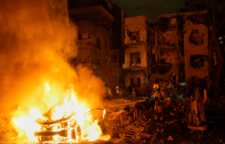 बिहान ७ः३० बजे (०४३० जिएमटी) इजरायलमा मिसाइलको दुई लहरका मिसाइल प्रहार भएपछिसार्वजनिक प्रसारणकर्ता क्यान ११ ले मध्य इजरायलमा रहेको भग्नावशेषको ढिस्कोले घेरिएको भवनको तस्बिर देखाएको छ ।