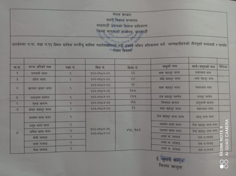 काठमाडौं, १४ असार । काठमाडौं उपत्यका विकास प्राधिकरण, जिल्ला आयुक्तको कार्यालय काठमाडौंले तारकेश्वर नगरपालिका वडा नं. ११ स्थित महादेव खोला आसपासको जग्गा अतिक्रमण गर्नेको तीनपुस्ते नामावली सार्वजनिक गरेको छ । प्राधिकरणले साविकको मनमैजु महादेव खोला उकासको जमिन अतिक्रमण गरेको भन्दै १३ जनाको तीनपुस्ते सार्वजनिक गरेको हो ।