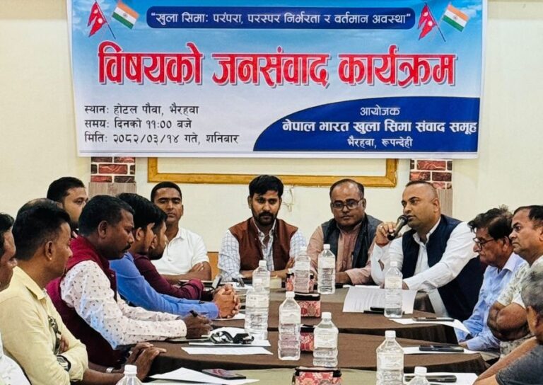 काठमाडौं, १४ असार । नेपाल–भारत खुला सीमा संवाद समूह, रुपन्देहीको आयोजनामा भैरहवाको होटल पौवामा “खुला सीमाः परम्परा, परस्पर निर्भरता र वर्तमान अवस्था” विषयक जनसंवाद कार्यक्रम सम्पन्न भएको छ ।