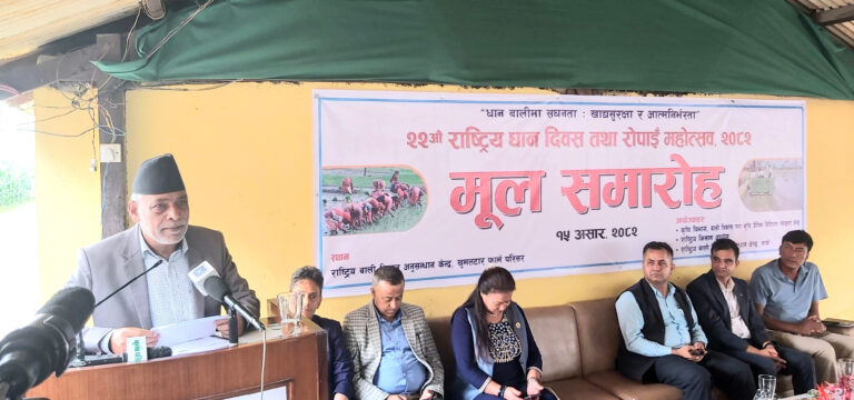 ‘धान बालीमा सघनता खाद्यसुरक्षा र आत्मनिर्भरता’ भन्ने नाराका साथ कृषि विभाग, बाली विकास तथा कृषि जैविक विविधता संरक्षण केन्द्र, राष्ट्रिय किसान आयोग र राष्ट्रिय बाली विज्ञान अनुसन्धान केन्द्र (नार्क)द्वारा आज राष्ट्रिय बाली विज्ञान अनुसन्धान केन्द्र खुमलटारमा आयोजित २२औँ राष्ट्रिय धान दिवस तथा रोपाइँ महोत्सव, २०८२ मा मन्तव्य राख्दै उनले स्रोत र साधनको सीमितताका बावजुद किसानका लागि राज्यले उचित ध्यान दिएर काम गर्ने बताउका हुन् ।