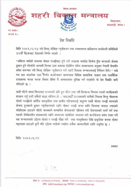 गत जेठ १४ गते बसेको विपद् जोखिम न्यूनीकरण तथा व्यवस्थापन प्राधिकरण कार्यकारी समितिको बैठकको निर्णयसमेत सार्वजनिक गर्दै मन्त्रालयले चोभारको गल्छी चौडा पार्ने कुनै उद्देश्य नरहेको स्पष्ट पारेको हो ।