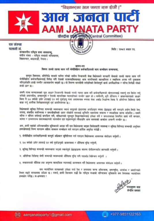 ‘यस न्यायोचित मागहरुको उपेक्षा गर्दा देश र जनतामा चरम अविश्वास, असन्तुष्टि, आक्रोश र अशान्तिको स्थित बढ्ने सम्भावना अधिक छ । यसर्थ, हामी विश्वास गर्छौं कि राष्ट्रिय सभाको गरिमामय भूमिकाले यस विषयमा न्यायोचित हस्तक्षेप गर्नेछ,’ आजपाले बुझाएको ज्ञापनपत्रमा उल्लेख गरिएको छ ।