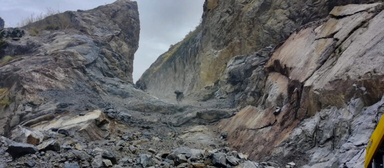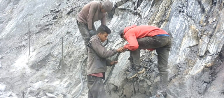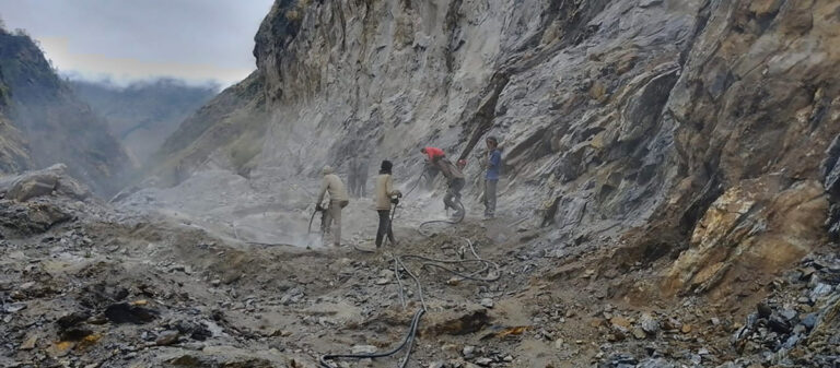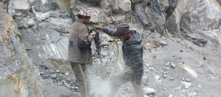 सिमकोट(हुम्ला), २० असार। हुम्लाको खार्पुनाथ गाउँपालिका–१ मा पर्ने बोक्चेगौडा भिरको सडक स्तरोन्नतिका क्रममा चट्टान फोड्दै गरेका श्रमिक । तस्बिर : दाने बोहरा / रासस